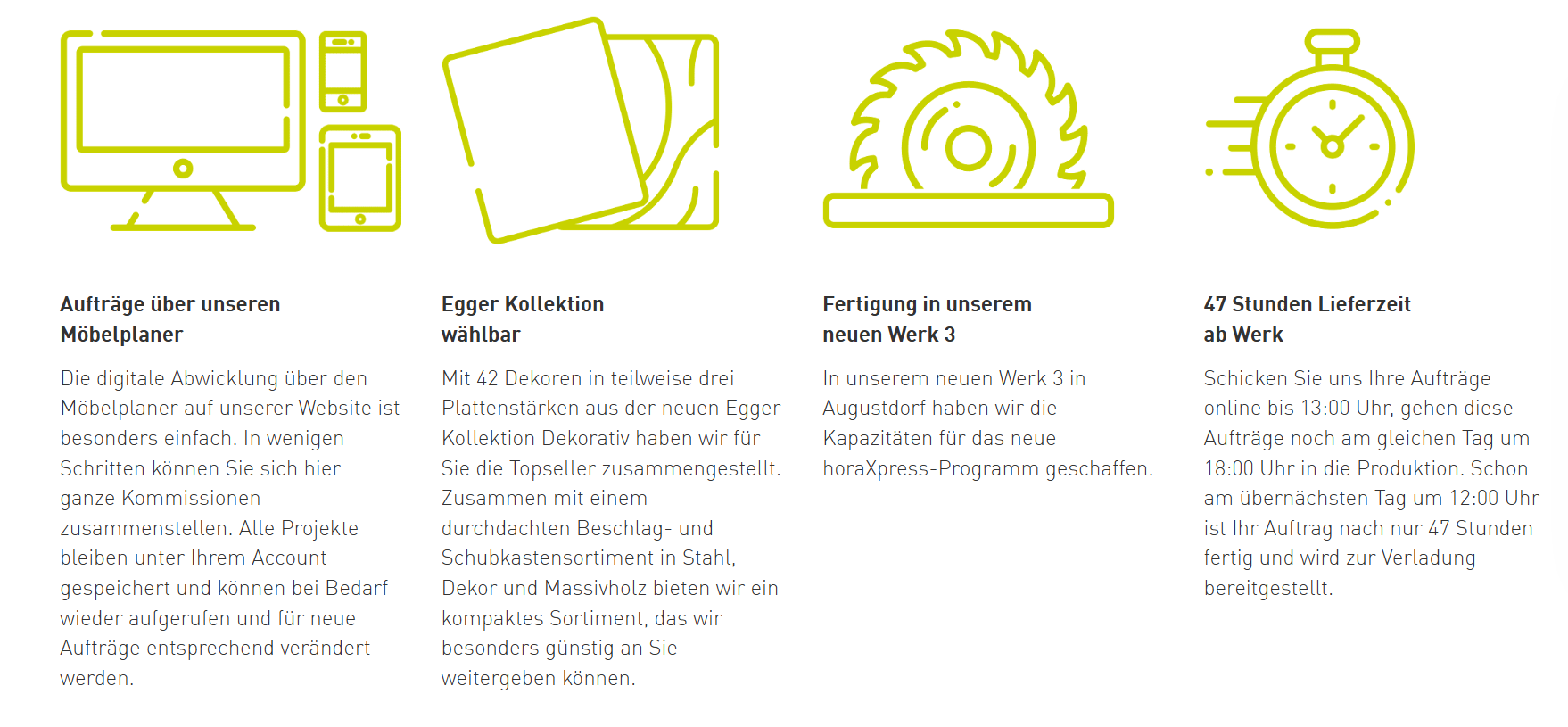 Darüber hinaus machen wir uns kontinuierlich Gedanken zum richtigen Sortiment, zur täglichen Planung und Abwicklung von Projekten, zu Kommunikations- und Serviceleistungen sowie über unsere Fertigungsprozesse. Die Ergebnisse fließen in ein einmaliges Konzept, das genau auf die Bedürfnisse des Tischler- und Schreinerhandwerks abgestimmt ist – das Horatec-Prinzip!