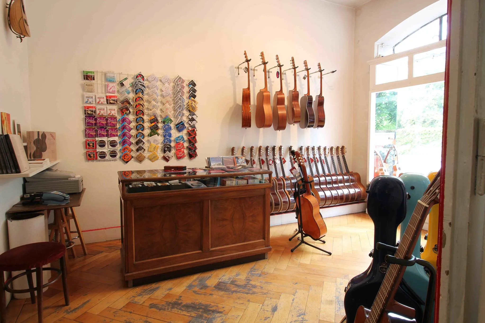 Depuis 1979, le magsin propose un vaste choix de guitares d'études, de concert et de collection. En plus des guitares classiques, vous trouverez également des guitares acoustiques, folk, ukulélés et autres instruments à cordes pincées, ainsi que tous types d'accessoires (cordes, étuis, CDs, livres, etc.).