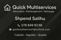 Quick Multiservices est votre partenaire de confiance pour la rénovation, le déménagement et le nettoyage dans la région. Fiable et réactif, Shpend Salihu met son savoir-faire au service des particuliers et entreprises pour des interventions rapides, soignées et de qualité. Qu’il s’agisse de rafraîchir un intérieur, d’organiser un déménagement ou d’assurer un nettoyage complet, Quick Multiservices garantit un service professionnel, efficace et adapté à vos besoins.